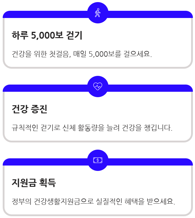 국민 건강 증진을 목적으로 시행되는 정책으로, 걷기와 같은 건강생활 실천 시 포인트를 지급합니다.