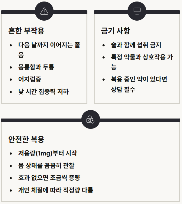 멜라토닌의 가장 흔한 부작용은 다음 날까지 이어지는 졸음, 몽롱함, 두통, 어지럼증이에요. 특히 처음 멜라토닌을 드시는 분들이나 고용량을 섭취하는 경우에 나타나기 쉬워요. 심하면 낮 시간 동안 집중력이 떨어지고 일상생활에 지장을 줄 수도 있죠.