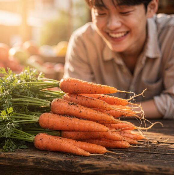 당근 속 베타카로틴은 비타민 A로 전환되어 망막과 눈 점막을 튼튼하게 하고, 야맹증 예방 및 황반변성 위험을 낮추는 데 도움을 줍니다.